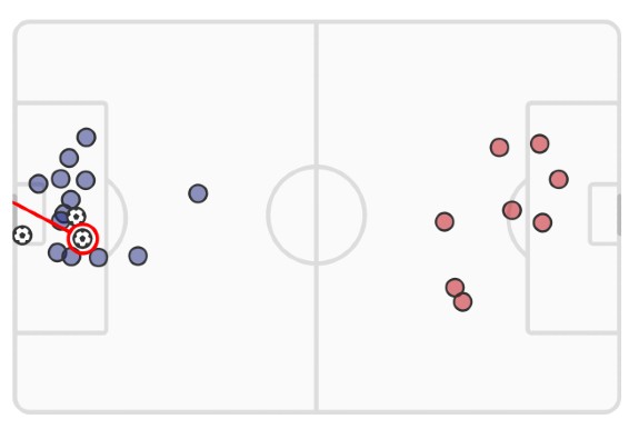 51st minute Saka chance vs Spurs xG 0.13 (blocked by Ben Davies following good Arsenal buildup)