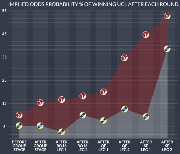The club came from behind against the French, European AND the English champions in the knockout stages of the UEFA Champions League to secure a historic 14th title. Here is a look at the implied probability after every knockout leg of theirs- it shows how much of an achievement it was to do what Real did here, and more so given the quality of their opposition.