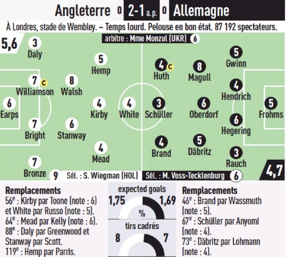 Here is a look at the player ratings for England vs Germany Women from their Euro 2022 final held on 31 July, 2022 from the big European sports newspapers (AS, L’Equipe). England beat Germany 2-1 in front of a 87,192 strong crowd (record Wembley attendance for a Euro final).