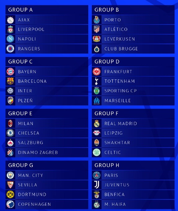 Group C with Barcelona, Bayern Munich, Inter and Viktoria Plzen appears to the Group of Death on paper. Other tricky groups appear to be Group A (Liverpool, Ajax, Napoli, Rangers) and Group G (Man City, Sevilla, Dortmund, Copenhagen)