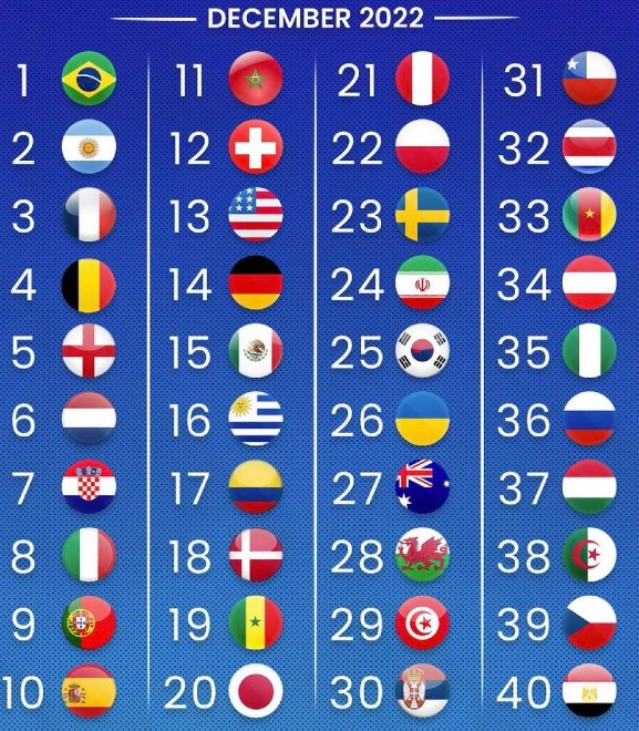 Top 40 football national teams FIFA Ranking December 2022 after WC