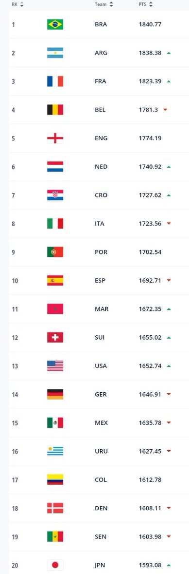 Top 20 soccer teams in the world as per FIFA ranking just after World Cup 2022
