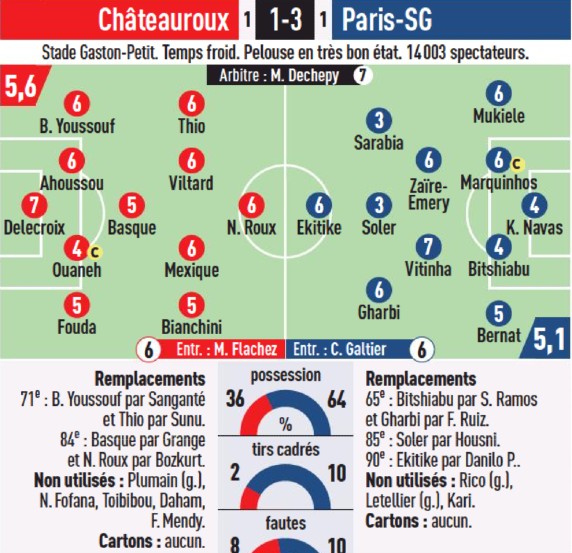 Here is a look at the L’Equipe newspaper player ratings for Chateauroux versus Paris Saint Germain, a fixture that ended 3-1 i favour of the latter. It wasn’t all smooth sailing for the Parisians though- the game was 1-1 till the final quarter until goals from Soler (78) and Bernat (90+1′) gave them a 3-1 win.