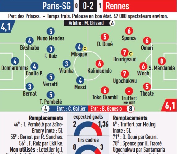 Ouest France player ratings Paris SG 0-2 Stade Rennais