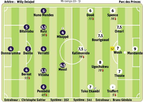 A 6.1/10 team rating for SRFC; PSG get just 4.1/10, with no individual getting a player rating higher than 5 for the Parisians.