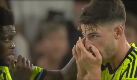 Star Arsenal midfielder Declan Rice needed help from Arsenal’s medical staff to adjust his contact lenses during their league game against Crystal Palace on 21 August, 2023.