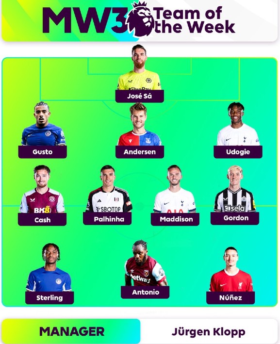 Here is a look at the Premier League Team of the Week for GW3 (Round 3) for the 23/24 season. Game Week 3 started with Chelsea beating Luton and finished with ten-man Liverpool beating Newcastle on the road.