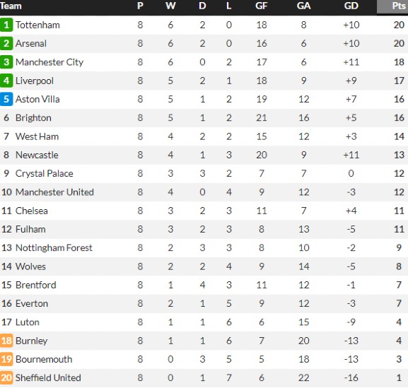 Here is a look at the Premier League table after 8 rounds in the current 23/24 season (just after Arsenal’s 1-0 win over Man City in October 2023)