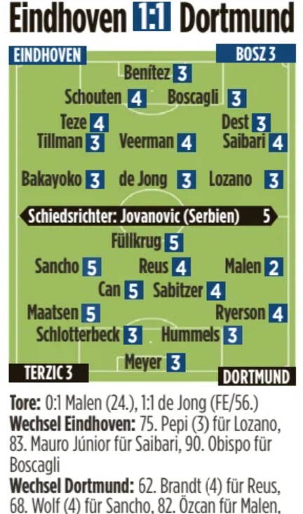 Bild thought Malen was the best player in Eindhoven vs Dortmund, giving him a 2 rating. They were not impressed with the performance of referee Jovanovic though- he got a 5 rating.