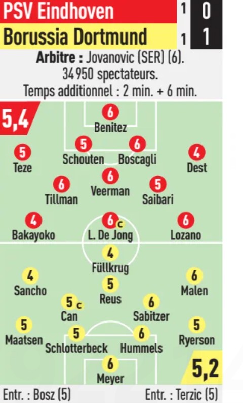 L’Equipe player ratings PSV vs Borussia Dortmund 1-1