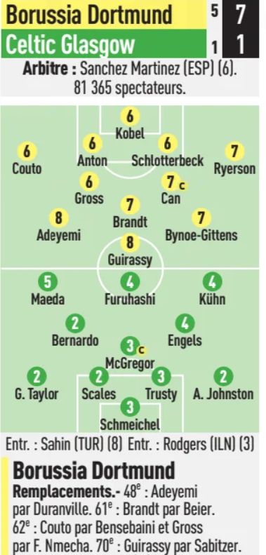Maeda again Celtic’s best player here in these ratings from L’Equipe (5/10). Plenty of 2/10 player ratings for Celtic’s players. On the BVB side, no one got more than 8/10- indicative of L’Equipe’s notoriously harsh standards.