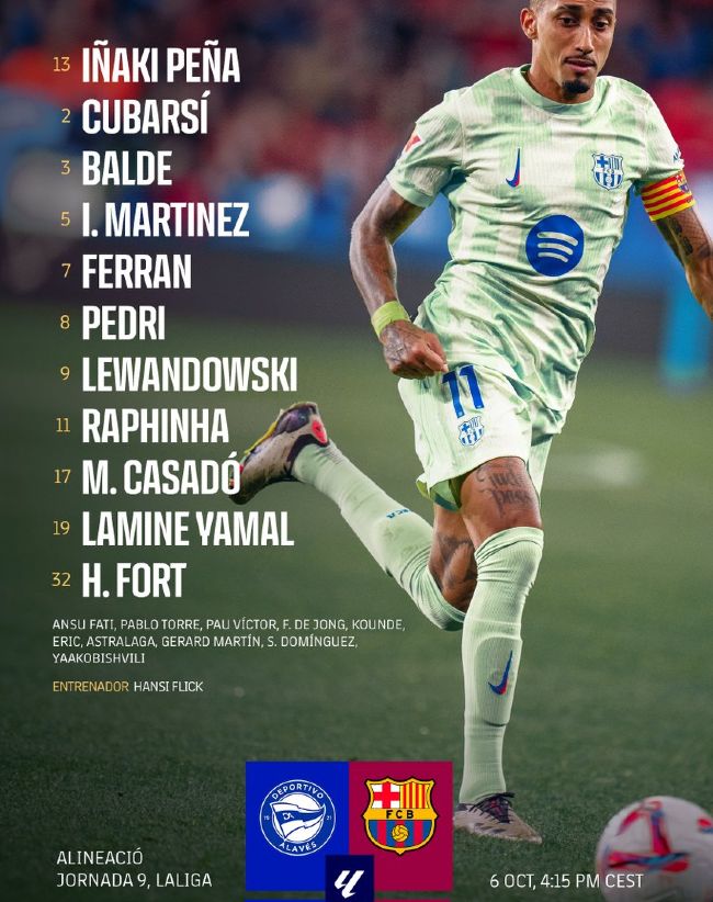Here is a look at the Club Deportivo Alaves vs F.C. Barcelona starting lineups and timeline of key moments from their La Liga clash on 6 October, 2024. Barcelona won 3-0 thanks to a hat trick from Robert Lewandowski, thus bouncing back from their GW8 loss against Osasuna.