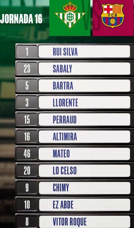 Fran Vieites; Youssouf Sabaly, Marc Bartra, Diego Llorente, Romain Perraud (Aitor Ruibal 71′); Mateo Flores (Isco 77′), Sergi Altimira; Chimy Avila, Giovani Lo Celso, Abde Ezzalzouli (Jesus Rodriguez 86′); Vitor Roque (Assane Diao 77′)