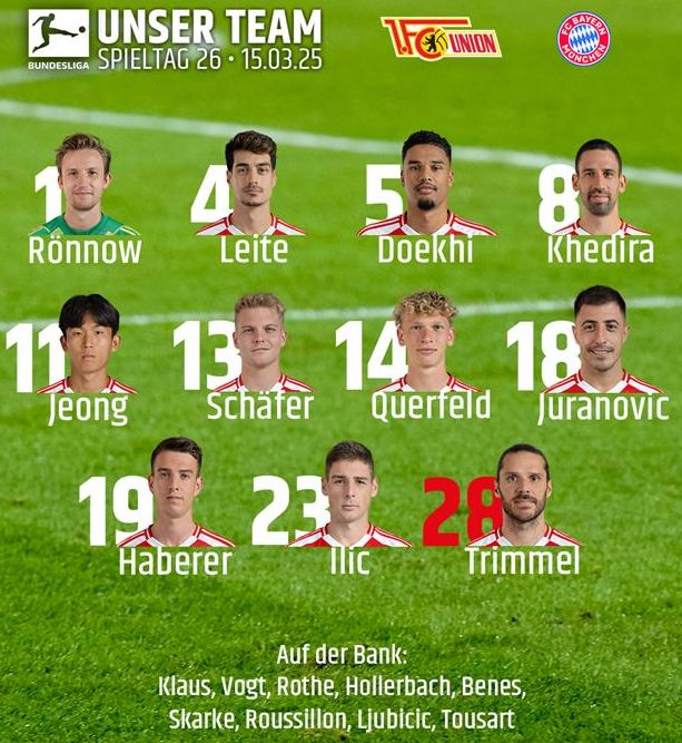 Here is a look at the FC Union Berlin vs FC Bayern Munich starting lineups as well as the FCU FCB Bild newspaper player ratings and timeline from their Bundesliga Week 26 game on 15 March, 2025 (official attendance of 22,012 at the Alte Foresterei Stadium)
