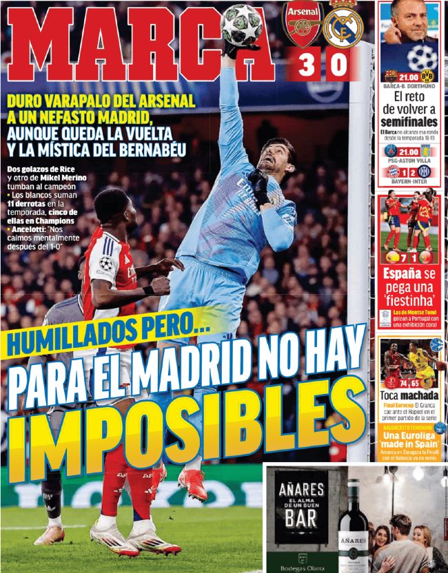 Here is a look at the newspaper headlines and front pages of some of Spain’s biggest sports newspapers following Real Madrid’s 3-0 loss to Arsenal in the first leg of their CL tie.