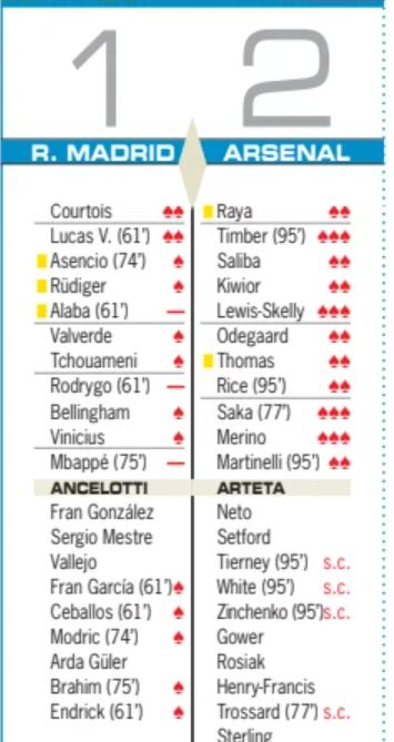 Mbappe wasn’t even deemed worthy of a player rating by Spanish newspaper Marca, and likewise for manager Carlo Ancelotti. Rice and Odegaard both got 3 stars, as did Martinelli.