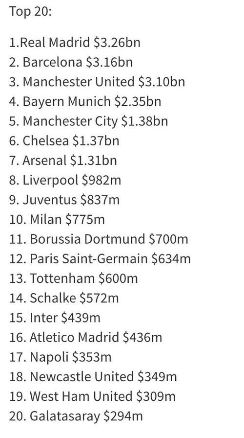 There are five Premier League sides in the top ten, with Man City, Chelsea, Arsenal and Liverpool (in that order) joining United. Italy have two representatives in the form of Juve and Milan, but only at 9 and 10 respectively. The richest English clubs after the big “five” are the trio of Spurs, Newcastle and West Ham, all of whom find spots in the top 20. Bayern are the only German club in the top 10