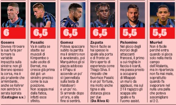 Gazzetta dello Sport player ratings for Atalanta v PSG