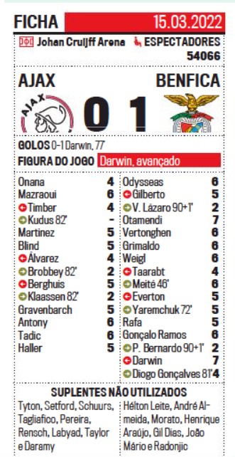 Ajax vs SLB ratings UCL Round of 16 Second Leg March 2022 from Corrieo da Manha