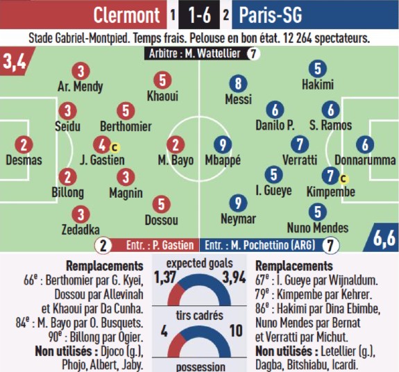 Here is a look at the player ratings for Clermont vs Paris SG from well known French newspaper L’Equipe. A rare occasion when all three of PSG’s MNM combination fired- and it resulted in L’Equipe giving both Mbappe and Neymar a 9/10 player rating and Messi a 8/10 one. Hakimi, Gueye and Nuno Mendes the lowest rated Paris Saint-Germain starters with a 5/10.