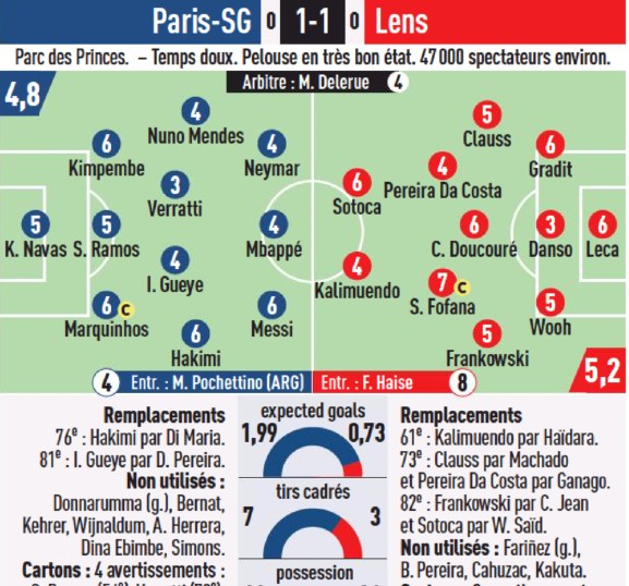Referee Delerue and Paris Saint Germain coach Pochettino also got a 4/10 rating, with Lens manager Franck Haise getting a 8/10 rating.
