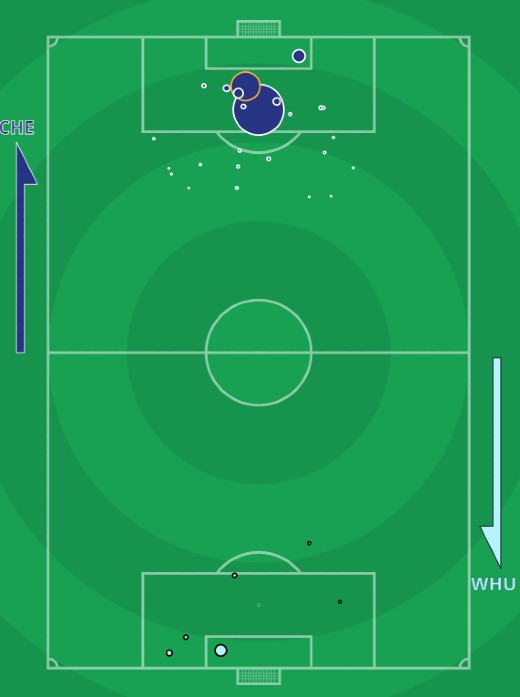 xG Chelsea 2.54-0.40 West Ham shots map (Actual score CFC 1-0 WHUFC)