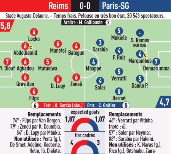 Here is a look at the player ratings for Reims vs PSG from well known French newspaper L’Equipe. Donnarumma the best Paris player against SDR according to L’Equipe, who gave him a 7/10 rating- no other PSG starter got more than 5. His opposite number Diouf also got a 7/10 rating.