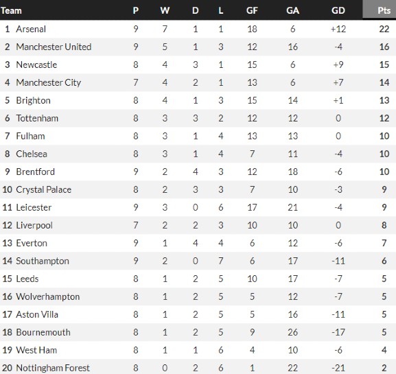 22/23 Premier League football table on 1st January 2023 (New Year’s Day 2023)