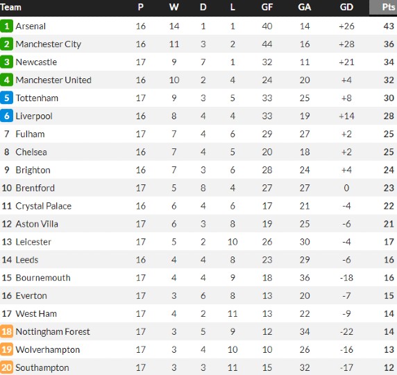 Premier League Table after 1 Jan fixtures (on 1 Jan 23:59 after Forest Chelsea and Spurs Villa fixtures)