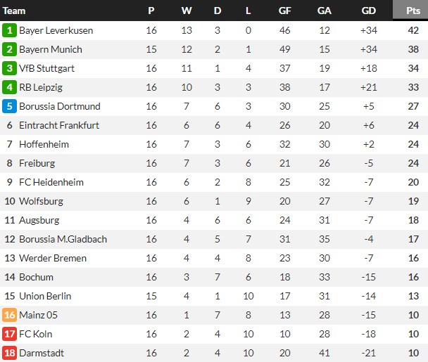 Bundesliga table 2023-2024 season at Christmas (December Winter break time)