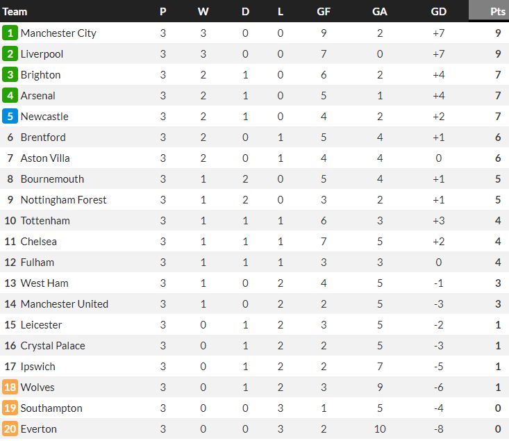 Here is a look at the Premier League table after Round 3- the EPL log as it stood before the September 2024 international break.