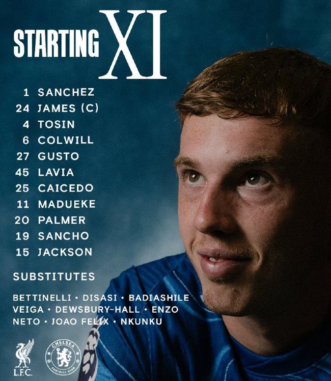 Chelsea FC: Sanchez; James (Veiga 53′), Tosin (Badiashile 53′), Colwill, Gusto; Caicedo, Lavia (Enzo Fernandez 53′); Madueke (Nkunku 76′), Palmer, Sancho (Pedro Neto 46′); Jackson