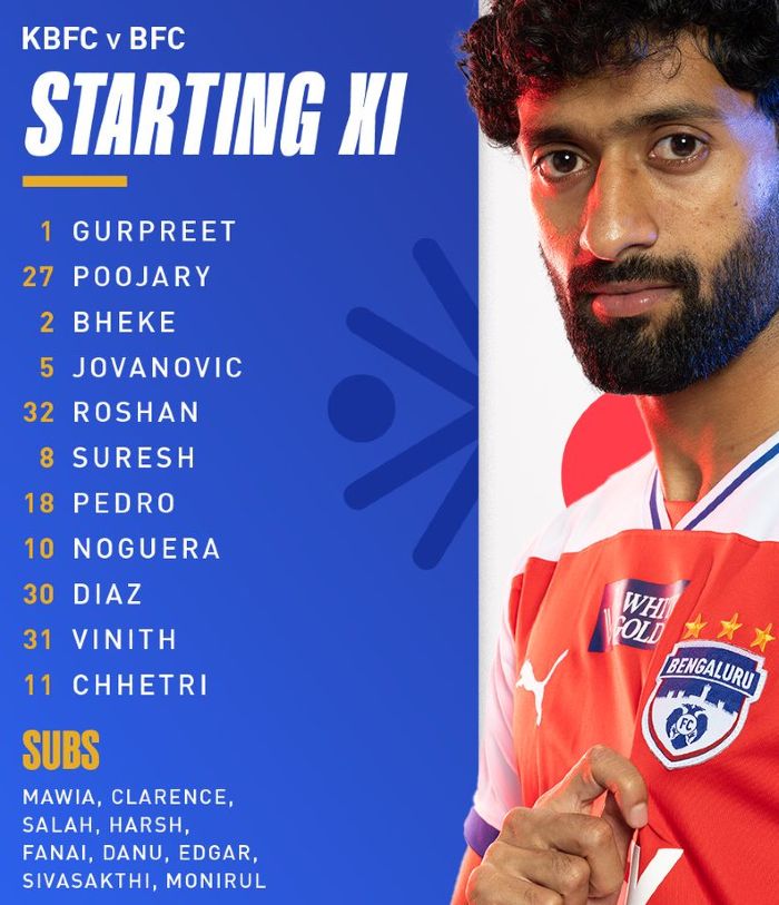 Here is a look at the Kerala Blasters vs Bengaluru FC starting lineups as well as the match stats from KBFC vs BFC and the timeline of key moments from their 2024/25 ISL season clash on October 25, 2024. BFC won the game 3-1.