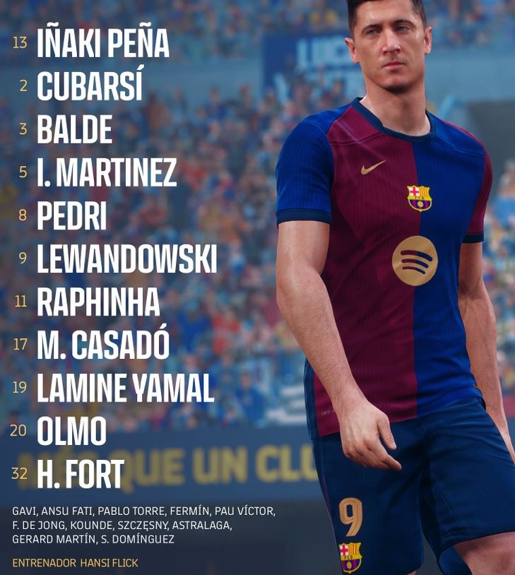 FCB: Inaki Pena; Fort (Kounde 78′), Cubarsi, Inigo Martinez, Alejandro Balde, Marc Casado (De Jong 56′), Pedri (Gavi 85′), Lamine Yamal, Olmo (Fermin Lopez 56′), Raphinha (Ansu Fati 85′), Lewandowski