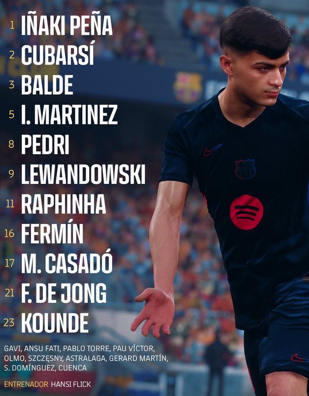 Barca: Inaki Pena; Kounde (Gavi 84′), Pau Cubarsi, Inigo Martinez, Balde; Casado, De Jong (Olmo 46′); Fermin Lopez (Ansu Fati 69′), Pedri (Pau Victor 90+1′), Raphinha, Lewandowski