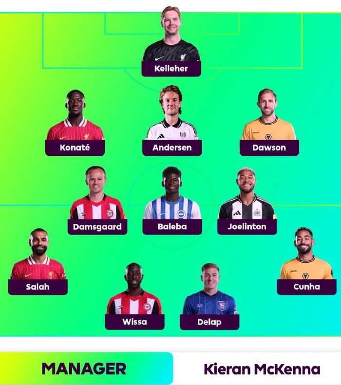 Salah (Liverpool), Cunha (Wolves), Wissa (Brentford), Delap (Ipswich)