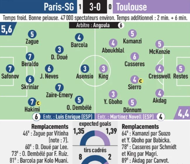PSG vs Toulouse FC 3-0 Player Ratings L’Equipe 2024-2025 season