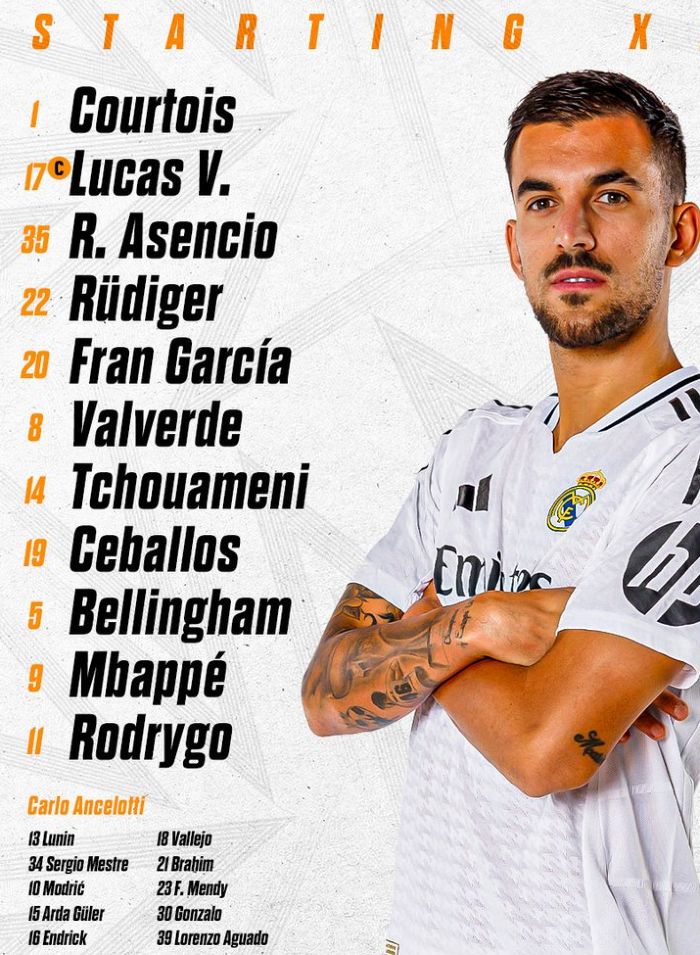 Courtois; Lucas Vazquez (Arda Guler 88′), Raul Asencio, Rudiger, Fran Garcia (Ferland Mendy 71′); Valverde, Tchouameni (Modric 71′), Ceballos (Brahim Diaz 58′), Bellingham; Rodrygo (Endrick 88′), Mbappe