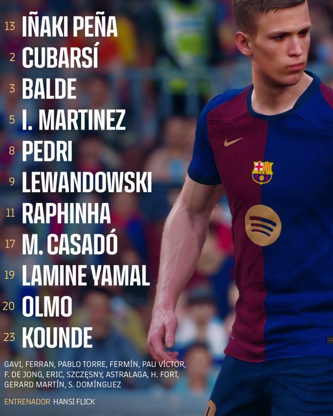 Inaki Pena; Kounde, Cubarsi, Inigo Martinez, Balde (Hector Fort 88′); Pedri (Gavi 74′), Casado, Olmo (De Jong 60′); Yamal, Lewandowski (Pau Victor 74′), Raphinha (Ferran Torres 60′)