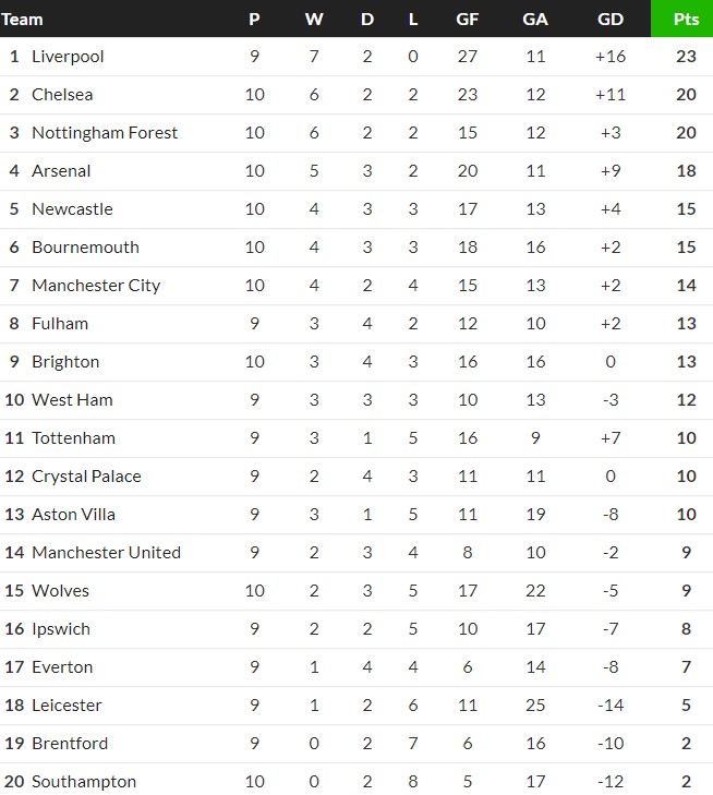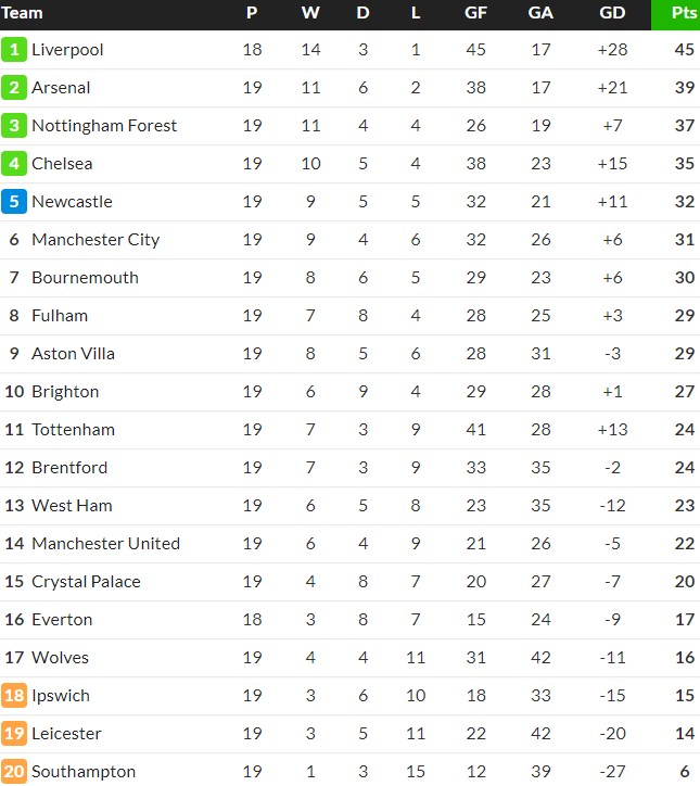 EPL Standings at the beginning of 2025 | Premier League 24/25 table at half way mark