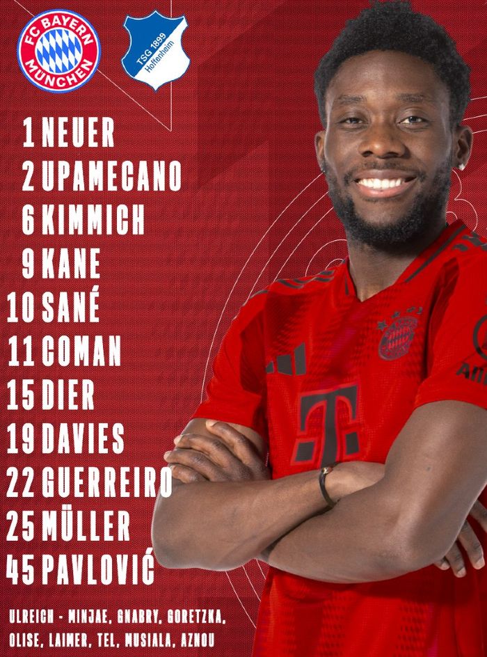 BAY: Neuer; Guerreiro, Upamecano (Goretzka 61′), Dier, Davies; Kimmich, Pavlovic; Sane (Olise 67′), Muller (Musiala 81′), Coman (Tel 46′); Kane (Gnabry 61′)