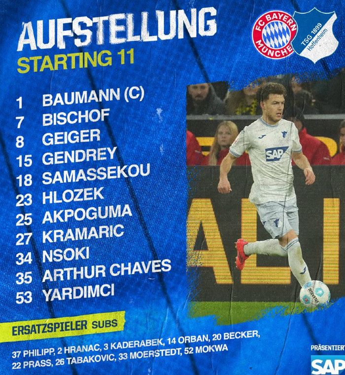 HOF: Baumann; Gendrey (Kaderabek 78′), Arthur Chaves, Akpoguma, Nsoki; Samassekou (Prass 41′), Bischof (Becker 63′); Geiger, Hlozek (Tabakovic 63′), Kramaric; Yardimci (Orban 46′)