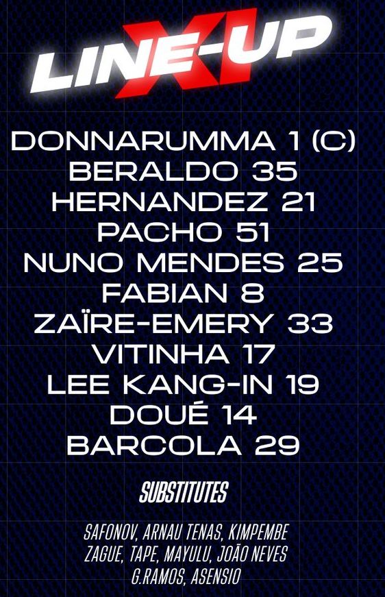 PSG: Donnarumma; Beraldo, Pacho, Lucas Hernandez (Joao Neves 60′); Zaire-Emery, Vitinha, Fabian Ruiz, Nuno Mendes; Barcola, Doue (Mayulu 88′); Lee (Ramos 60′)