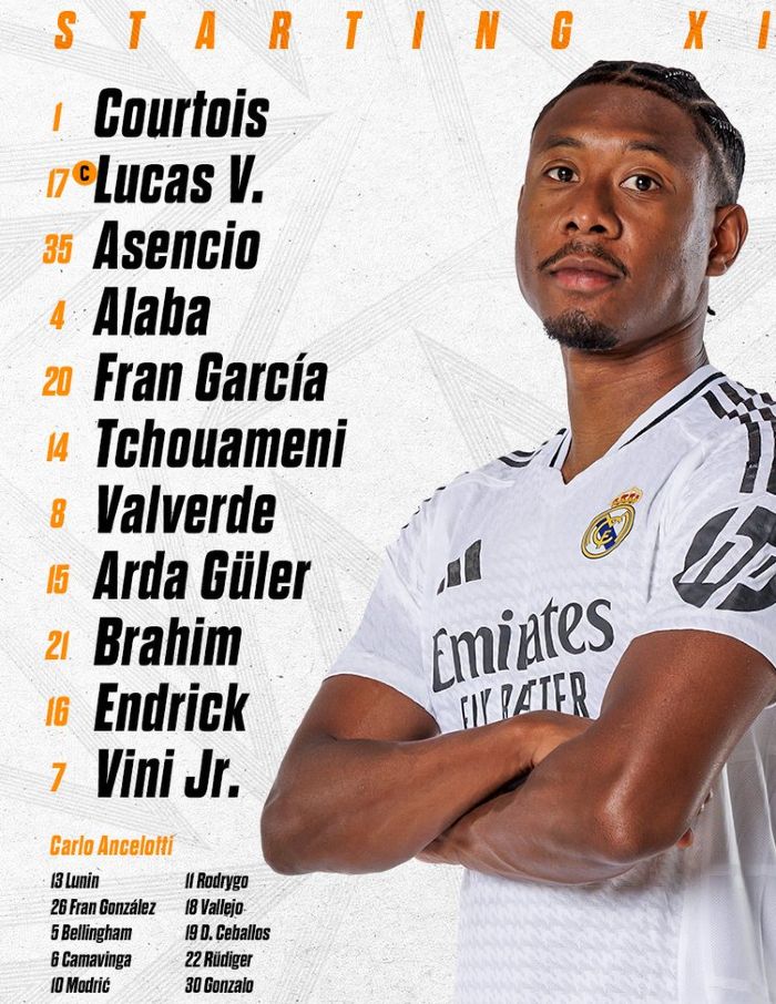 Courtois (GK); Lucas Vazquez, Asencio, Alaba (Camavinga 46), Fran Garcia; Brahim Diaz, Guler (Ceballos 78), Tchouameni, Valverde; Endrick (Bellingham 64), Vini Jr (Rodrygo 73)