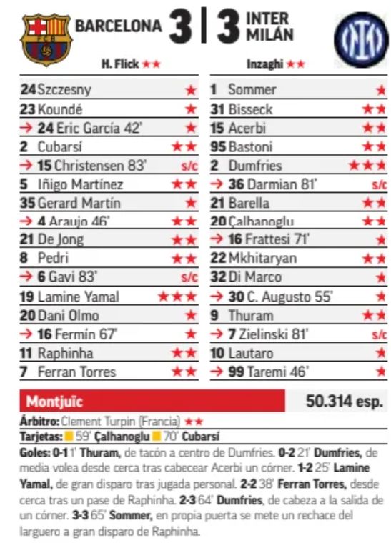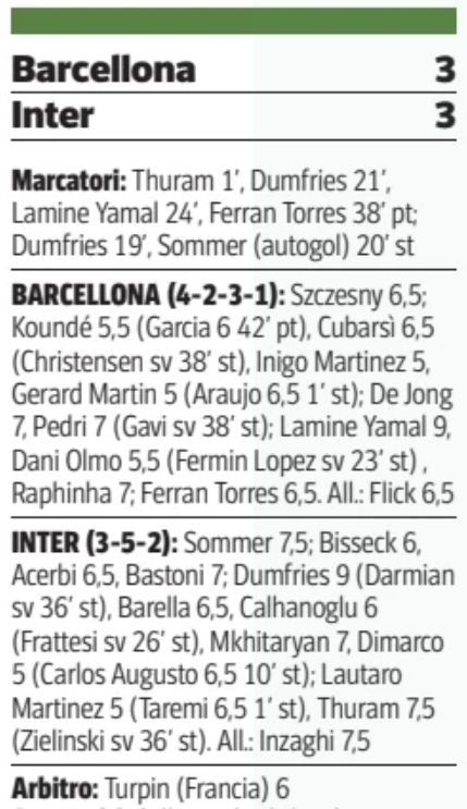 A 9/10 rating for Dumfries and Yamal from Italian paper CdS. They thought Inter manager Inzaghi (7.5) outcoached Hansi Flick (6.5) and gave referee Turpin a 6/10 for his performance.