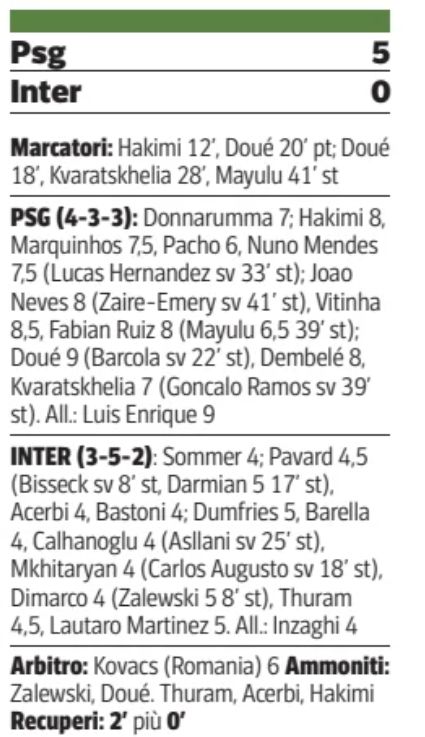 Corriere della Sera player ratings Paris St Germain 5-0 Inter