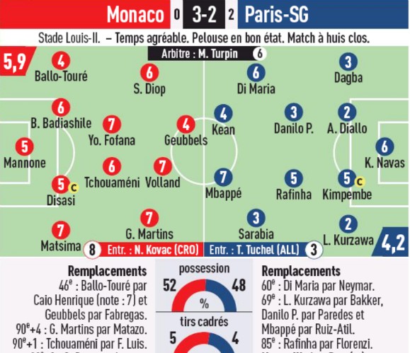 Here is a look at the player ratings for Monaco vs PSG on November 20, 2020 from the big French papers. Paris were 2-0 up thanks to Mbappe’s brace, but Monaco produced a stunning second half comeback to win the game 3-2. Abdou Diallo red carded late in the game for Paris Saint Germain